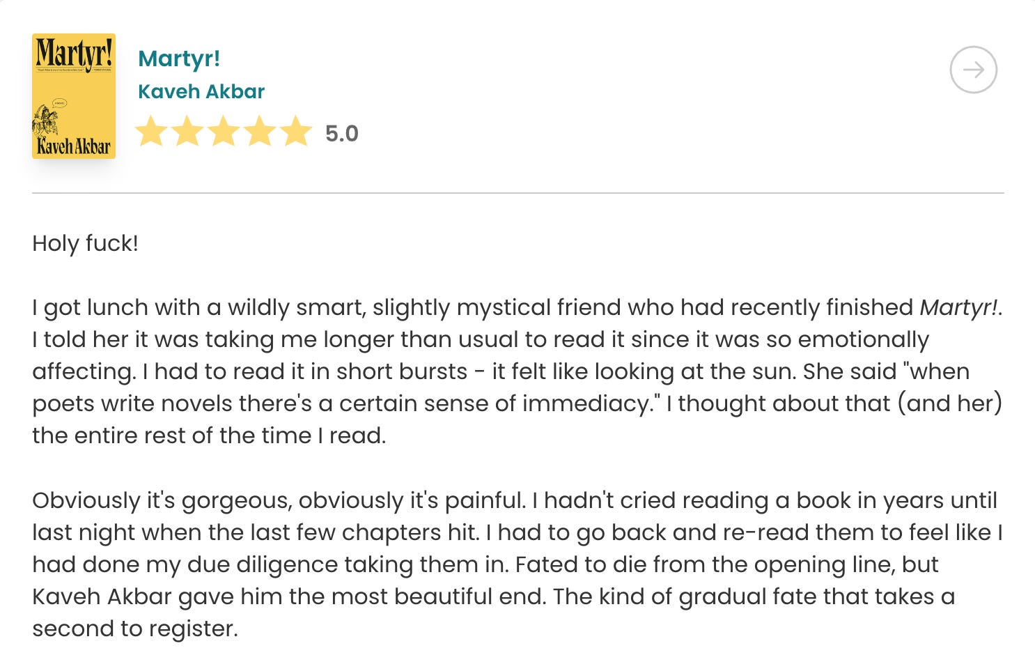 I read so much on tour, near-constantly in the van, and since being home I’ve slowed down a bit. To keep myself in the swing of it I’ve started setting my alarm for an hour before I actually want to go to sleep, getting cozy, and reading. I just finished Martyr and it was staggeringly good. Next up is The Rabbit Hutch.